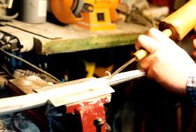 with a compass saw. Then it was split in two halfparts, and made hollow by chiseling out